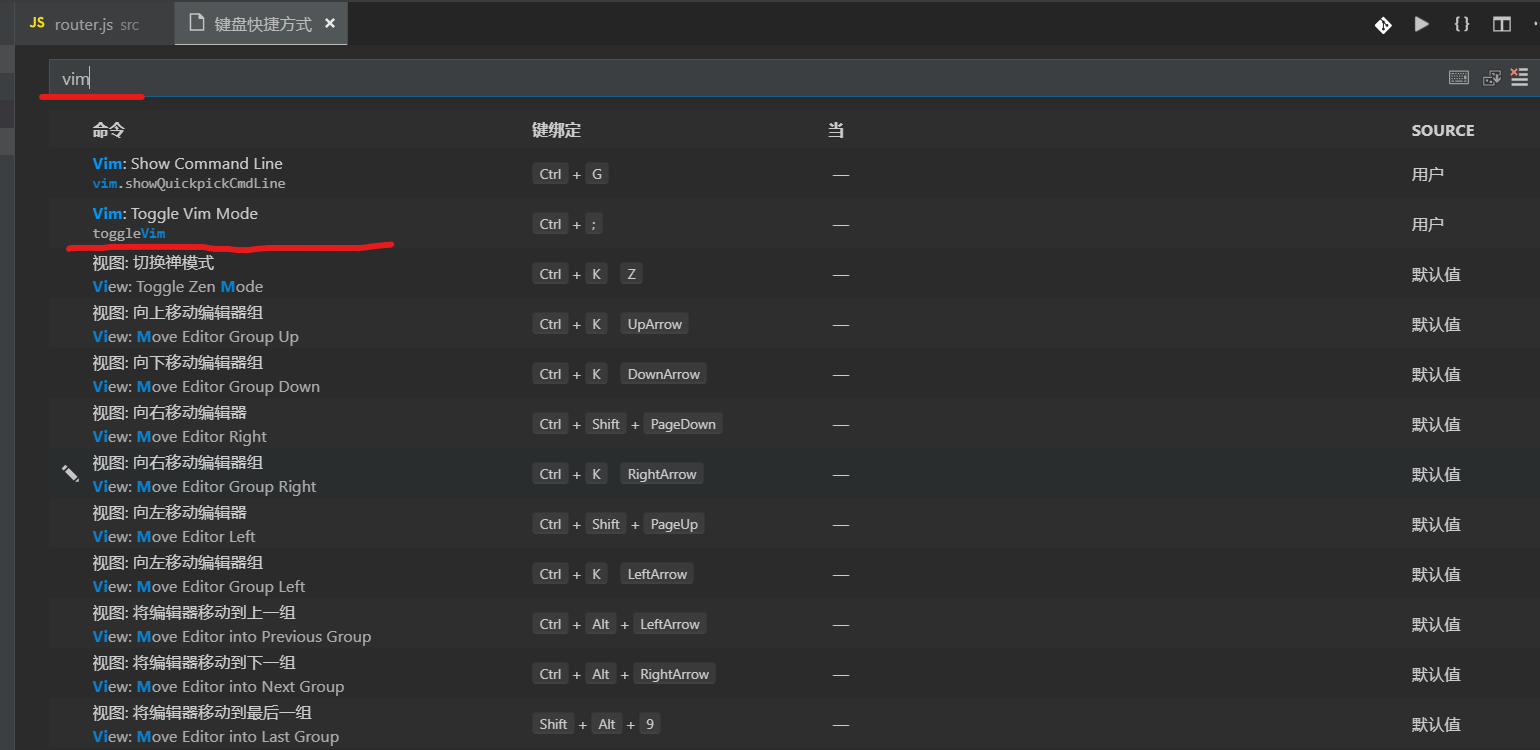 在快捷键设置中搜索vim