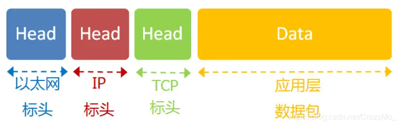 如上所示IP 数据包在以太网数据包里面,而TCP 数据包则在 IP 数据包的负载里面且它的头信息最少也需要20字节,因此 TCP 数据包的最大负载是 1480 - 20 = 1460 字节。再加上 IP 和 TCP 协议往往有额外的头信息,所以 TCP 负载实际为1400字节左右。因此,一条1500字节的信息需要两个 TCP 数据包。