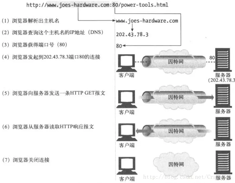 首先经过DNS 协议映射到对应的IP地址 再经过TCP协议分割,并按照序列号可靠发出 借助IP协议,,通过路由器得到对应的接收IP地址 然后经过TCP协议接收分割后得到的报文段并重组 最终经过HTTP协议,返回服务器处理报文后的资源