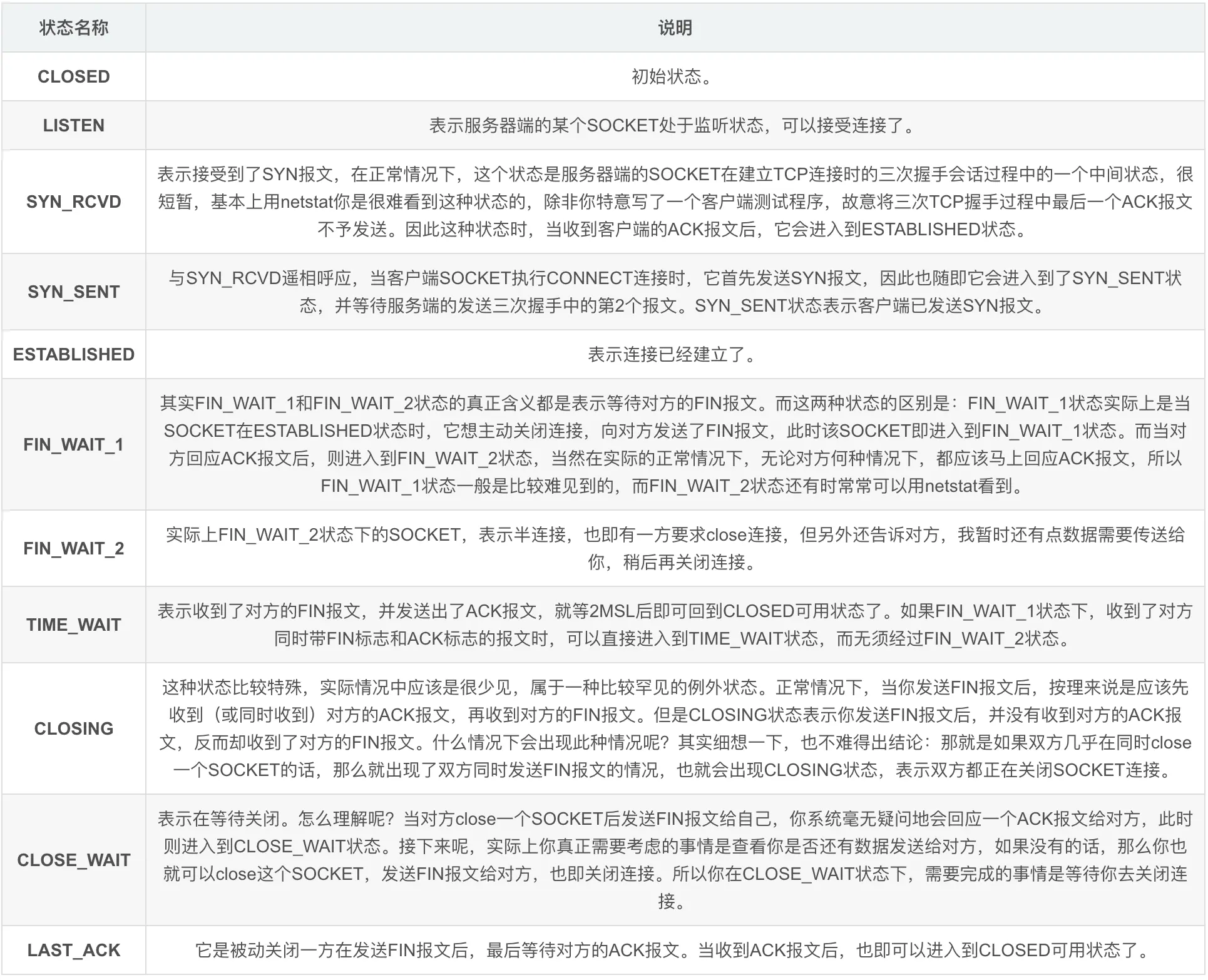 它是主动关闭的一方在回复完对方的挥手后进入的一个长期状态,这个状态标准的持续时间是4分钟,4分钟后才会进入到closed状态,释放套接字资源。一方面可以保证重传最后一个ack报文,确保对方可以收到。因为如果对方没有收到ack的话,会重传fin报文,处于time_wait状态的套接字会立即向对方重发ack报文;另一方面在这段时间内,该链接在对话期间于网际路由上产生的残留报文(因为路径过于崎岖,数据报文走的时间太长,重传的报文都收到了,原始报文还在路上)传过来时,都会被立即丢弃掉。4分钟的时间足以使得这些残留报文彻底消逝,防止“已失效的连接请求报文段”出现在本连接中可能会干扰新的链接。