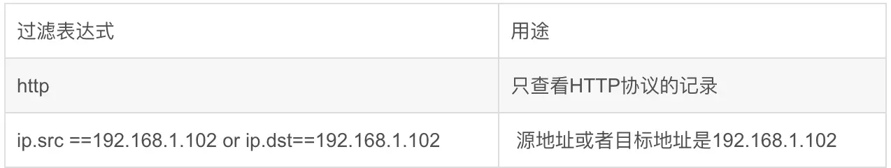 比如 ip.src ==192.168.1.102 显示源地址为192.168.1.102,