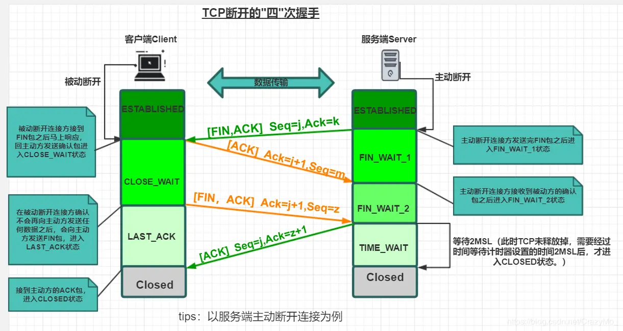 举个例子假设S端发起中断连接请求(即发送FIN报文),C端接到FIN报文后,就知道:“S端没有数据要发给自己了”,但是如果C端还有数据未处理完成就不必马上关闭socket,还可以继续发送数据,但你先发送ACK告知S端"你的请求我收到了,但是我还没准备好,请继续你等我的消息"。此时S端就进入FIN_WAIT状态,继续等待C端的FIN报文。当C端确定数据已处理完毕不会再向S端发送数据时才向S端发送FIN报文,告知S端"好了,我这边数据发完了,准备好关闭连接了"。但是C端不确定S端是否已经收到了,所以会在收到S端的ACK之后才会进入CLOSED状态,而S端则继续等待了2MSL后依然没有收到回复,则证明C端已正常关闭,于是S端也就关闭了,TCP连接释放。