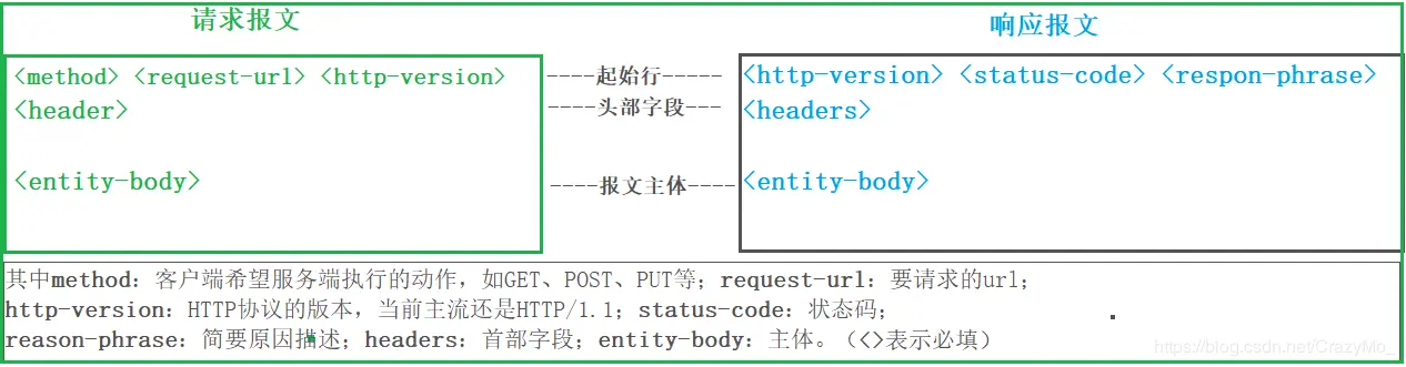 通常按照HTTP报文的类别又可以分为两种类型:请求报文和响应报文,不过两种报文基本机构大同小异都包含三大部分:起始行、首部、主体。