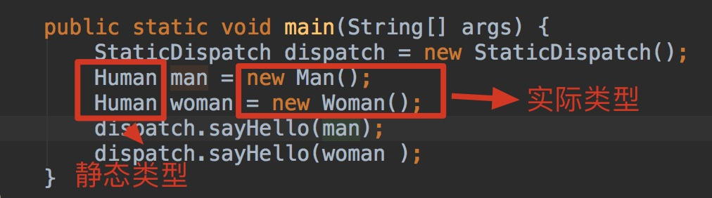 这个显然不是通过静态类型来判断两个变量的行为,因为两个变量的静态类型一样啊,都是Human。