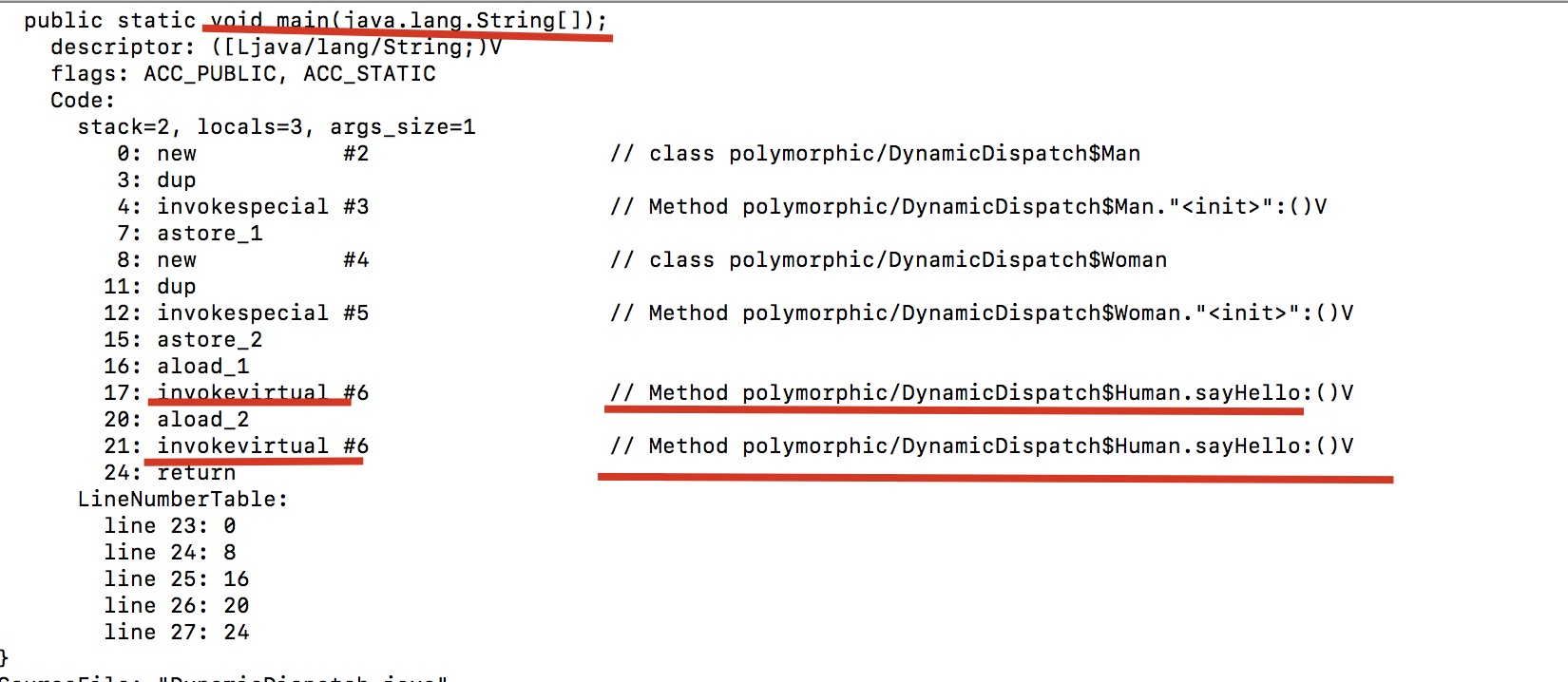 我们看到他是找的实际类型,所以两次调用invokevirtual指令把常量池中的符号引用解析到了不同的直接引用上,这个过程就是Java重写的本质