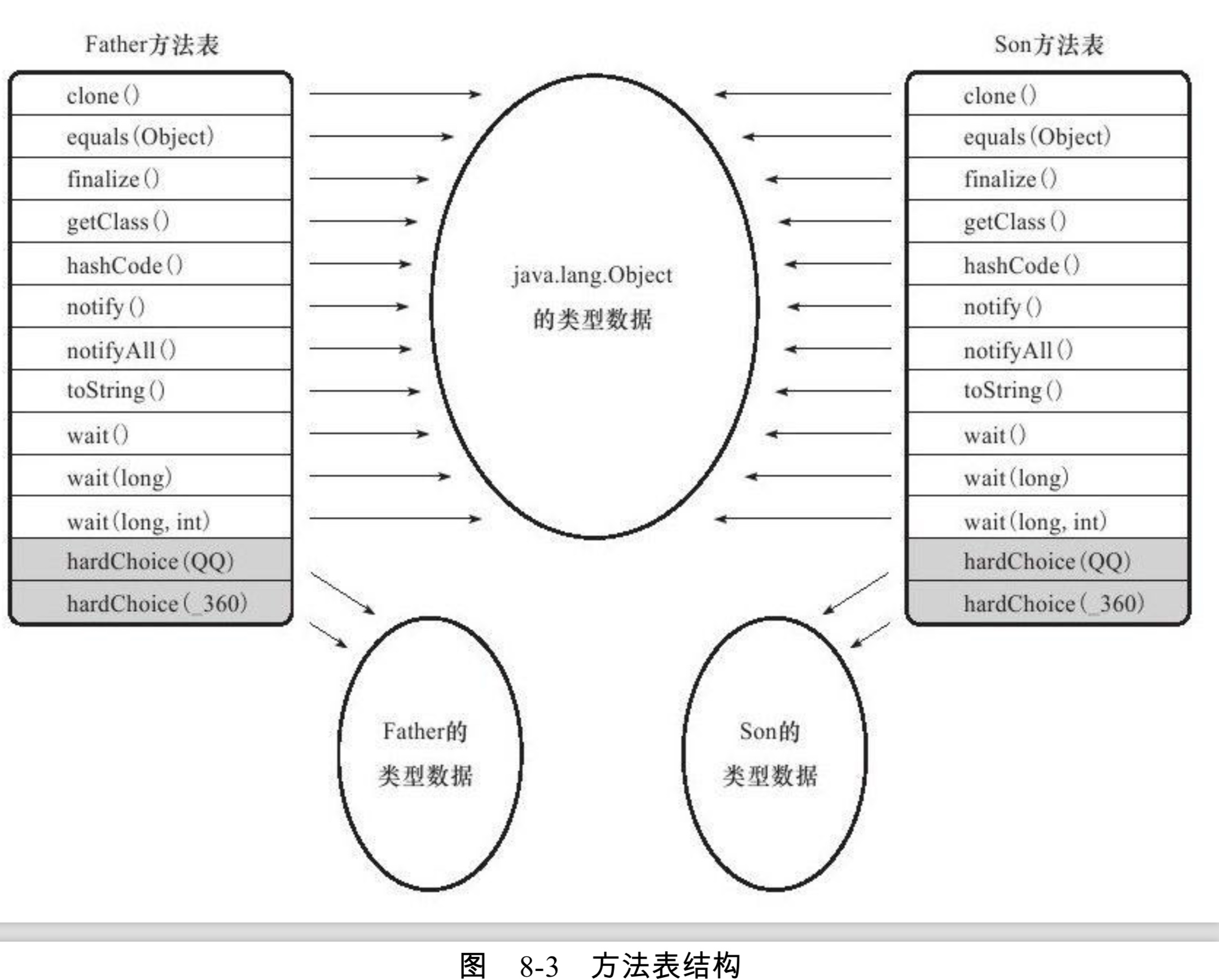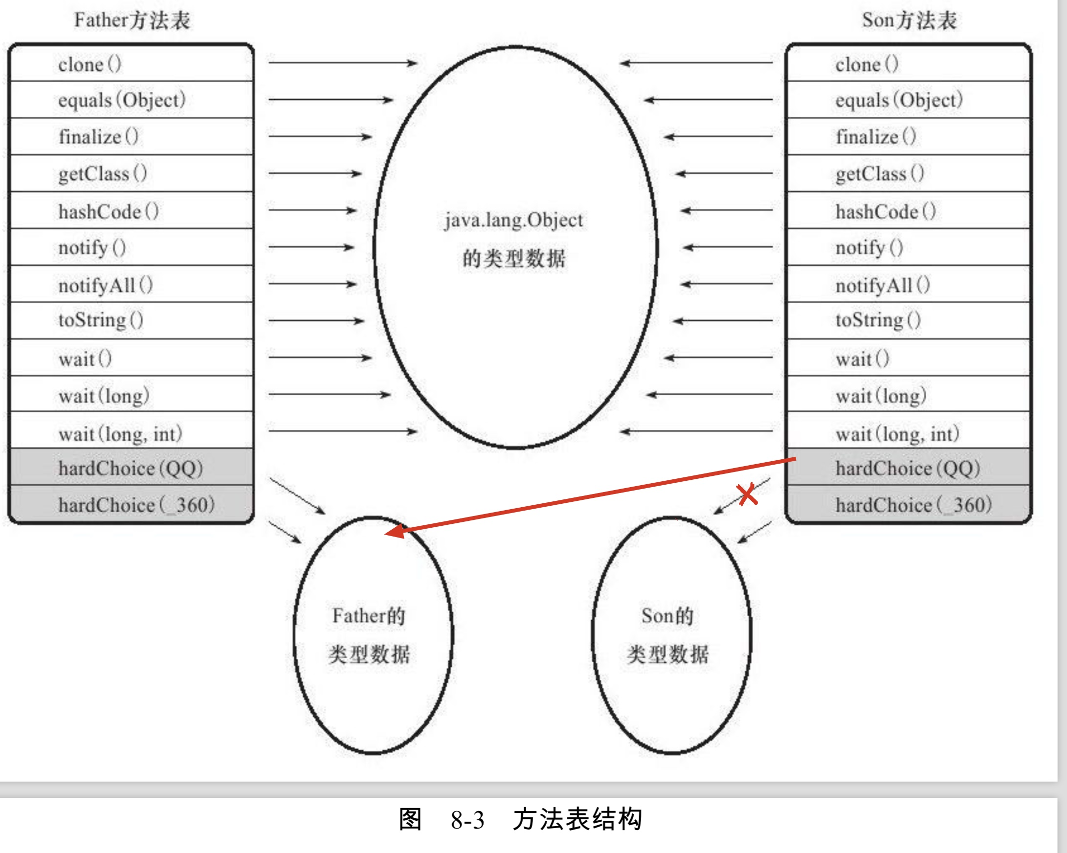 我们看上面的图就能明白,Son重写了来自Father的全部方法(clone这些是Object中的,不是Father的),所以Son的那些方法的入口地址没有指向Father的。而他们都没有重写来自Object的方法,所以那些方法都指向Object方法的入口地址