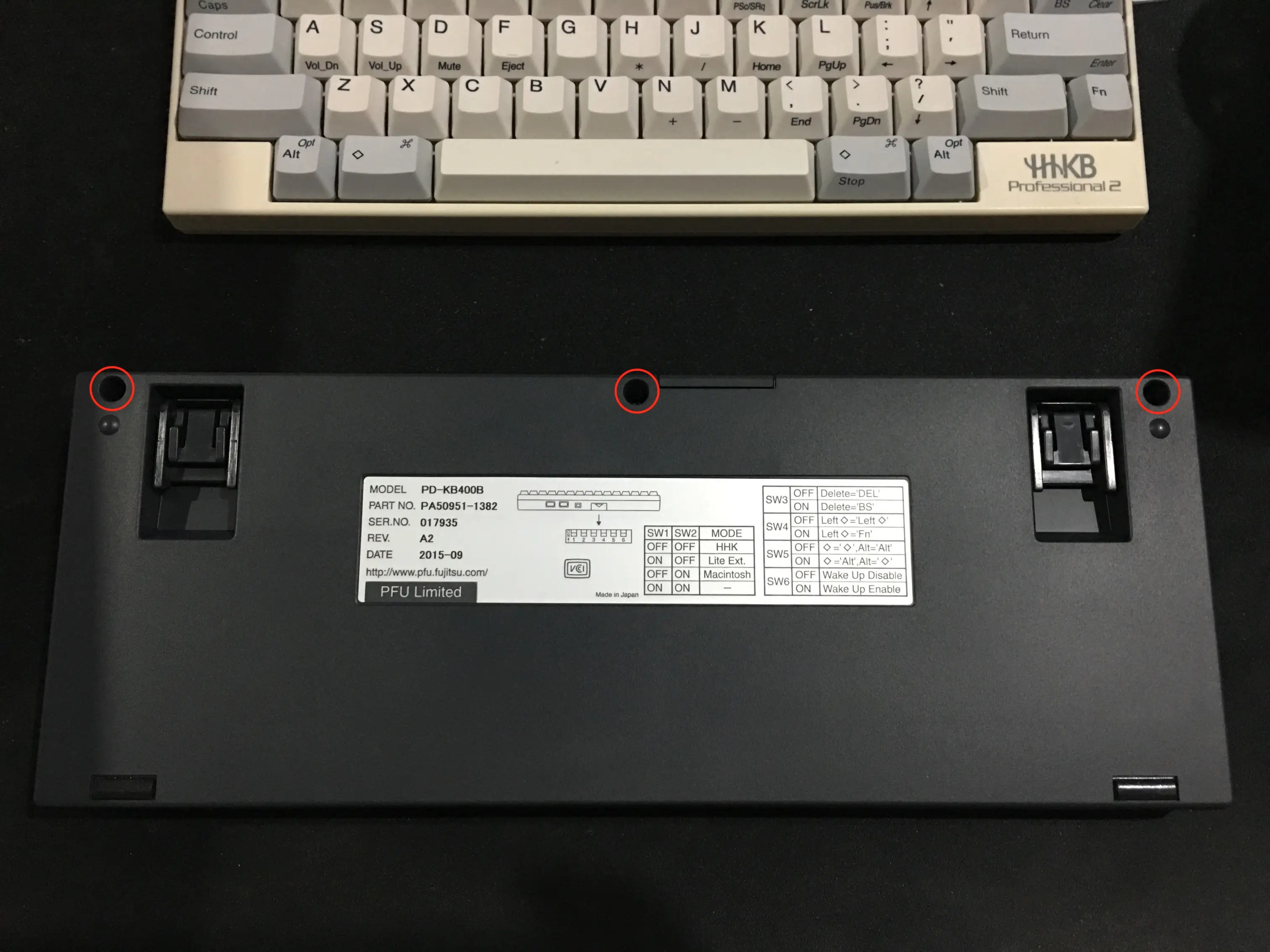 首先,我们要打开HHKB的外壳,用十字螺丝刀把键盘背面的这三个螺丝卸下即可。