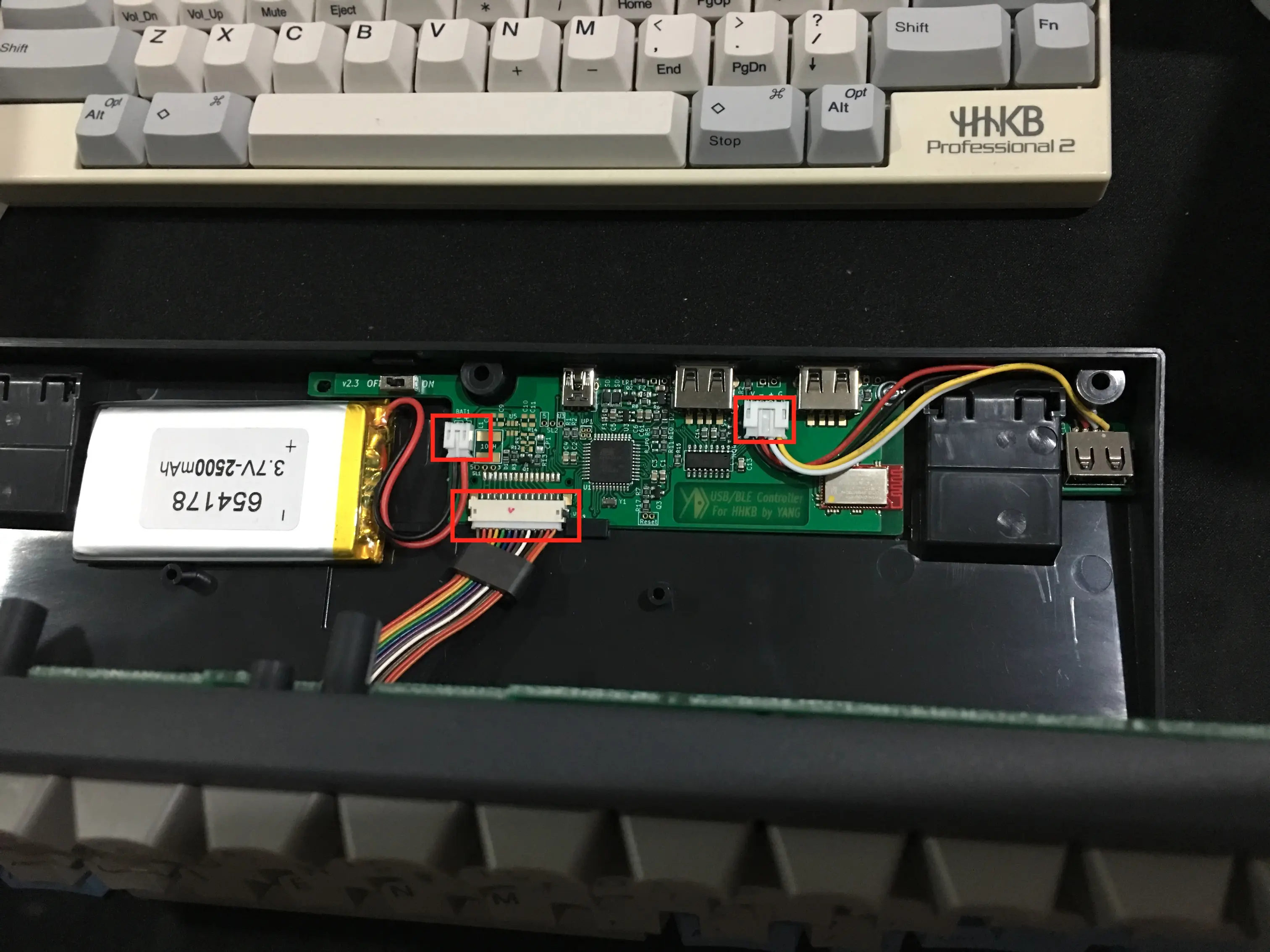 然后,我们就可以换上我们新买的双模主控芯片了。我们可以先把下图中红框里的三部分接口插好,然后再把主控芯片安装回到背壳上,这样会比较容易一些。把连接好的主控芯片重新用螺丝固定好,然后把电池和内部的USB接口按下图的方式摆好。右边的那个USB接口是一个内部的接口,可以在上面插一个小U盘来实现一个内置的存储功能。