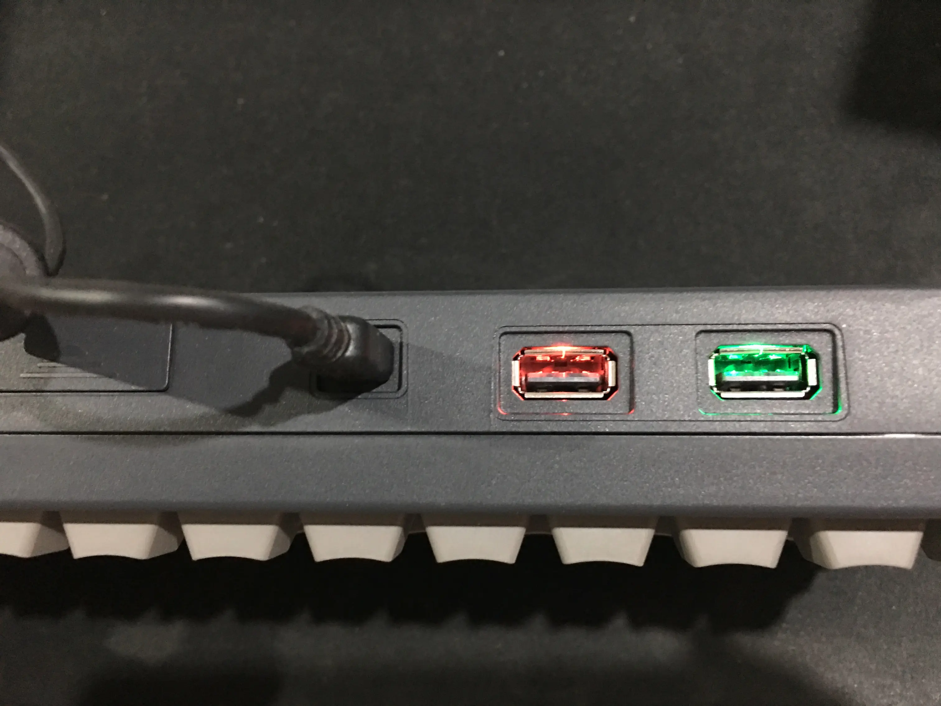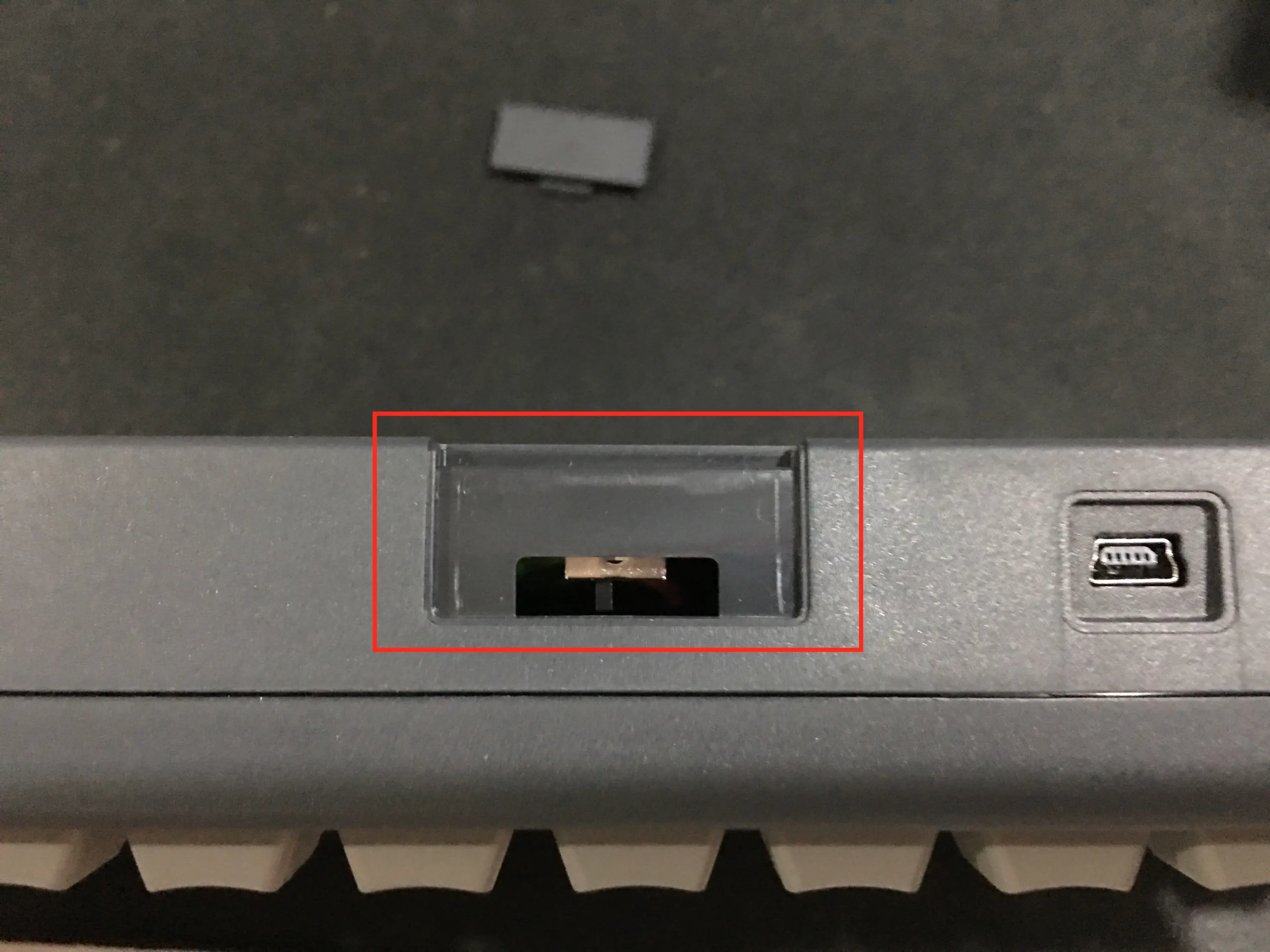 通过miniUSB接口之后就可以对电池进行充电了,下图中的红色灯就是充电的指示灯,充满之后会熄灭。右边的绿色指示灯表示键盘当前是否处于刷机模式,在下面的配列修改过程中会用到。