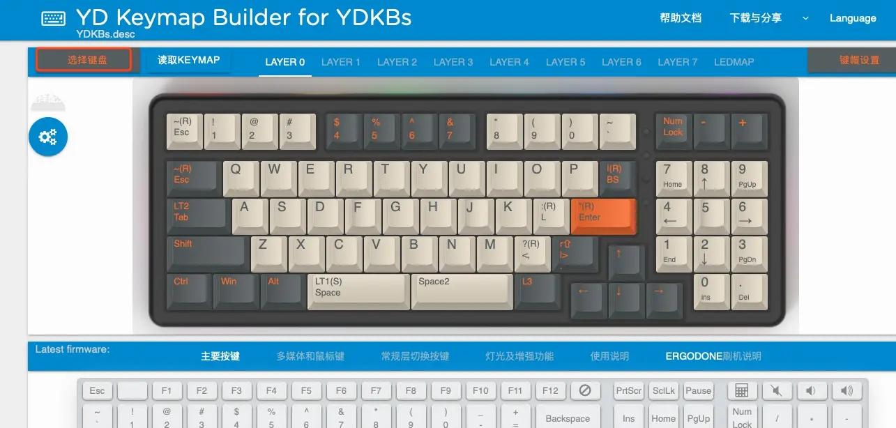 首先,我们登录配列生成网站ydkb.io,然后会出现下图这样的界面,我们可以点击红框中的“选择键盘”按钮选择我们对应的按键布局。