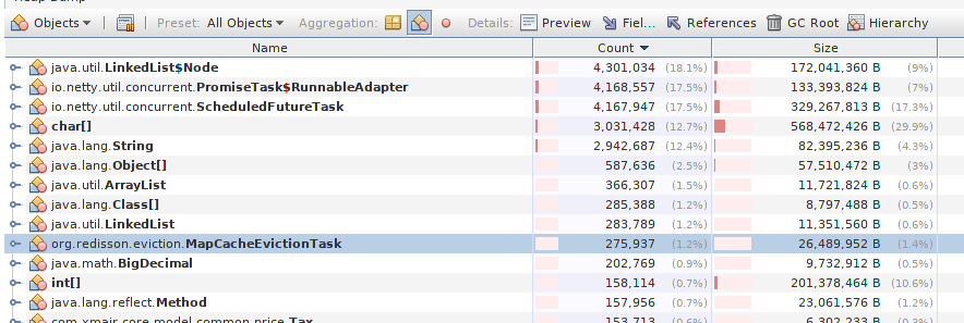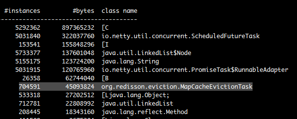 但是ScheduleFutureTask&PromiseTask相关对象并未释放,联想到前面 Redisson的Eviction机制,猜测是RMapCache进行擦除(过期)任务导致在netty调度时,出现: