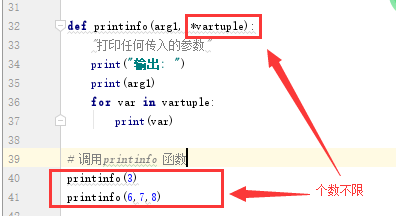 加了星号(*)的变量名会存放所有未命名的变量参数。不定长参数实例如下: