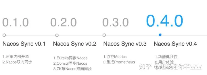 Nacos Sync 目前已经发布3个小版本,通过下图,我们可以看到每个版本已经做了的一些工作,以及下个版本即将做的一些事情。