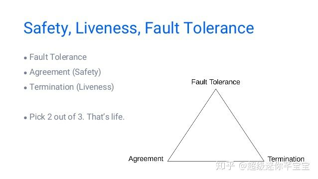 从另一个角度来理解,FLP实际上考虑了分布式系统的3个属性:安全(safety)、活性(liveness)、容错:
