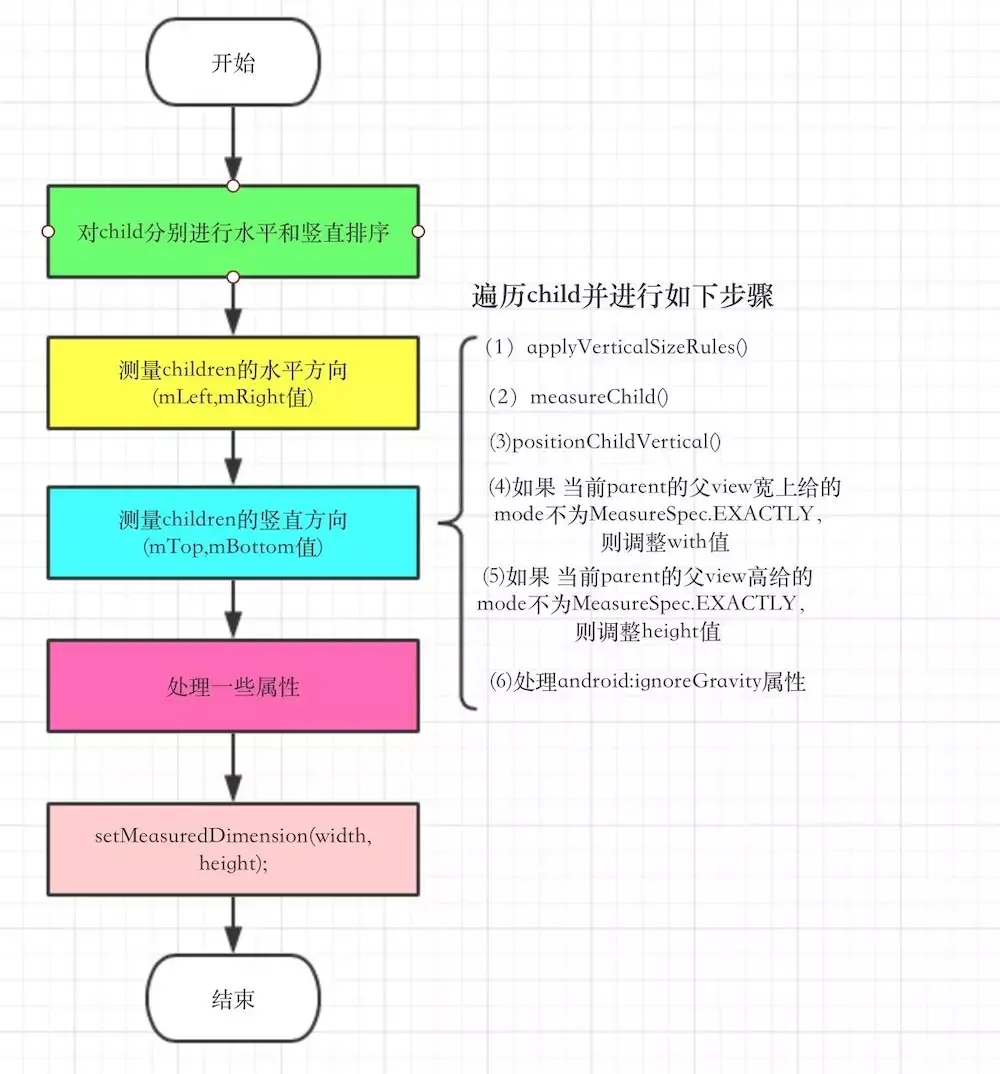 在OnMeasure中会测量两次子View,第一次水平方向根据水平方向规则(toLeft,toBottom等)测量获取子View左右值(mLeft,mRight),高度可认为设置为最大值。第二次测量根据竖直方向的规则(Above,Bottom等)测量获取子View上下值(mTop,mBottom)。