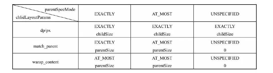 UNSPECIFIED: 父容器不对View有任何限制,要多大给多大,这种情况一般用于系统内部,表示一种测量的状态。 (如ListView或ScrollView)EXACTLY:一个明确的大小值,如多少多少dp或matchparentAT_MOST:对应于LayoutParams中的wrap_content。