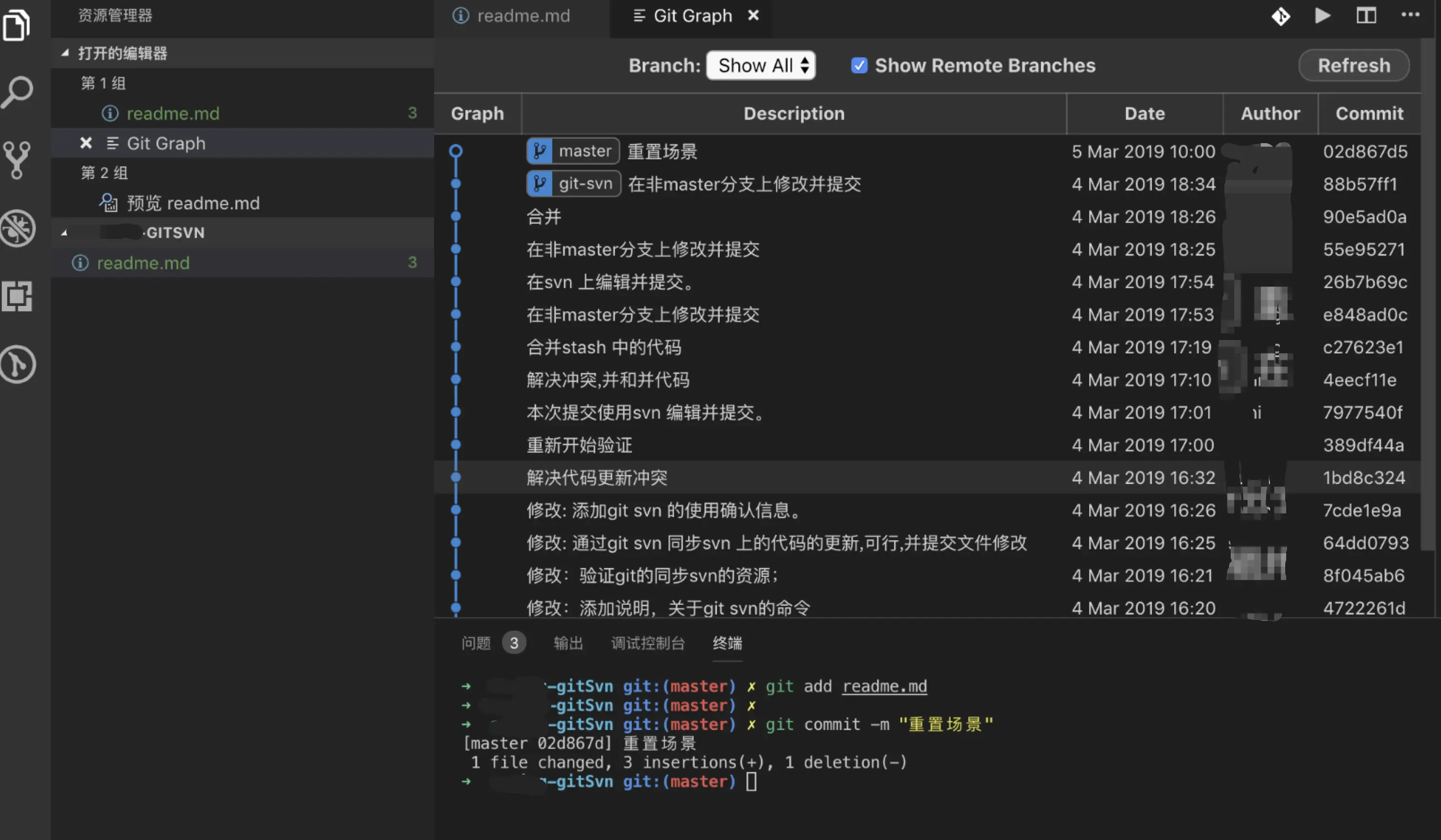 第六步: 解决冲突后,提交master上的修改到svn端;