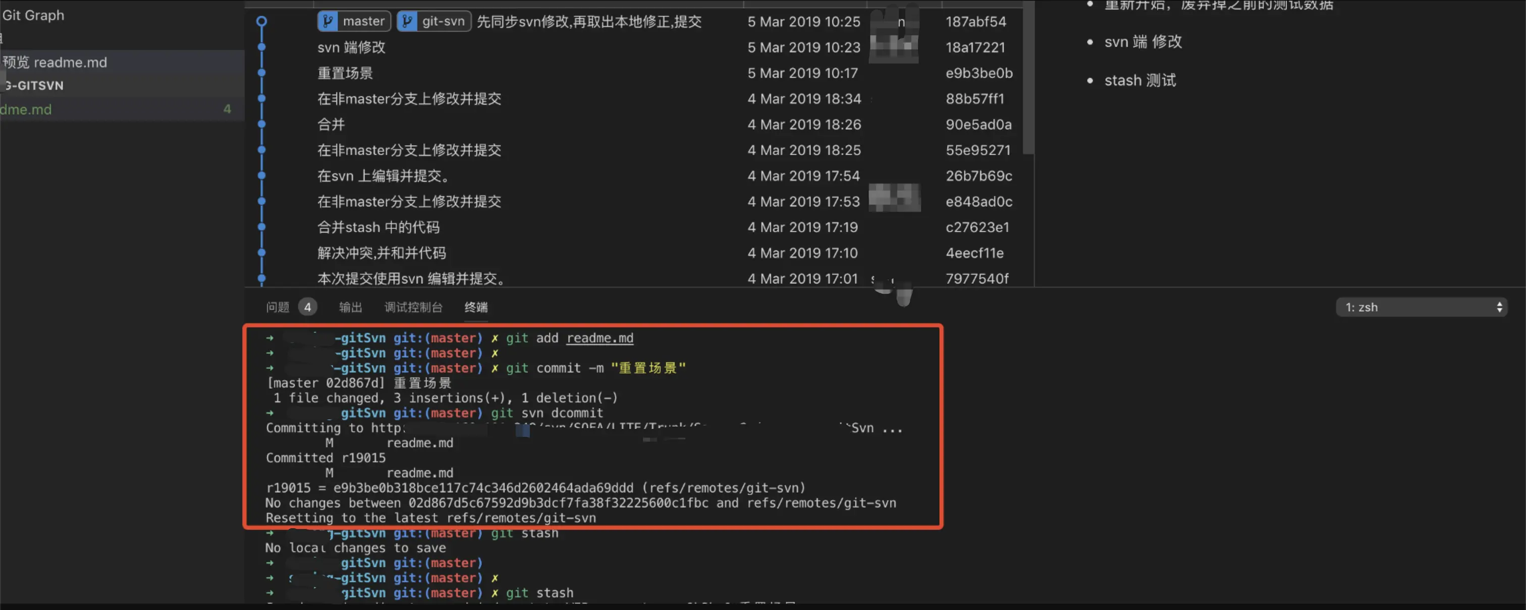 (2) 如果是大量变动,建议保持master分支的干净,保持只有master于svn 同步(即,只在master分支上,执行相关的git svn 命令),在单独的开发分支,进行开发,最终 merge 或 rebase 修改到 master 分支(注意:合并之前先同步svn端的更新),然后同步到svn;----> 对应练习场景四