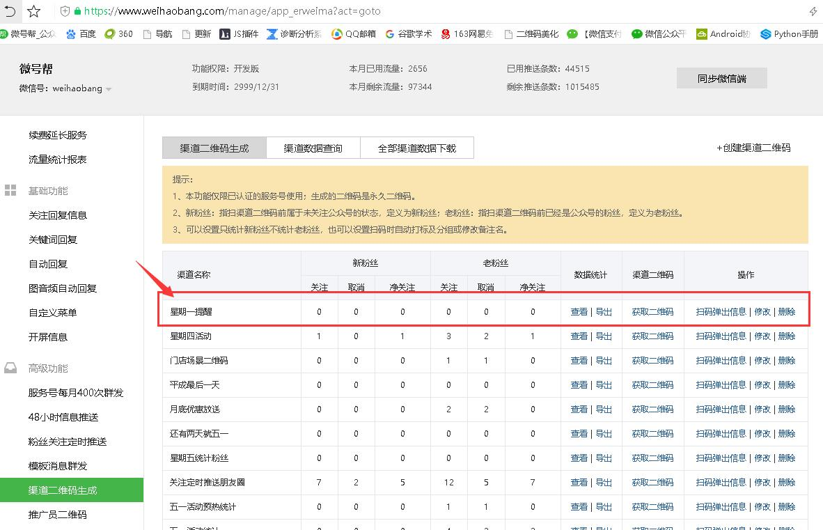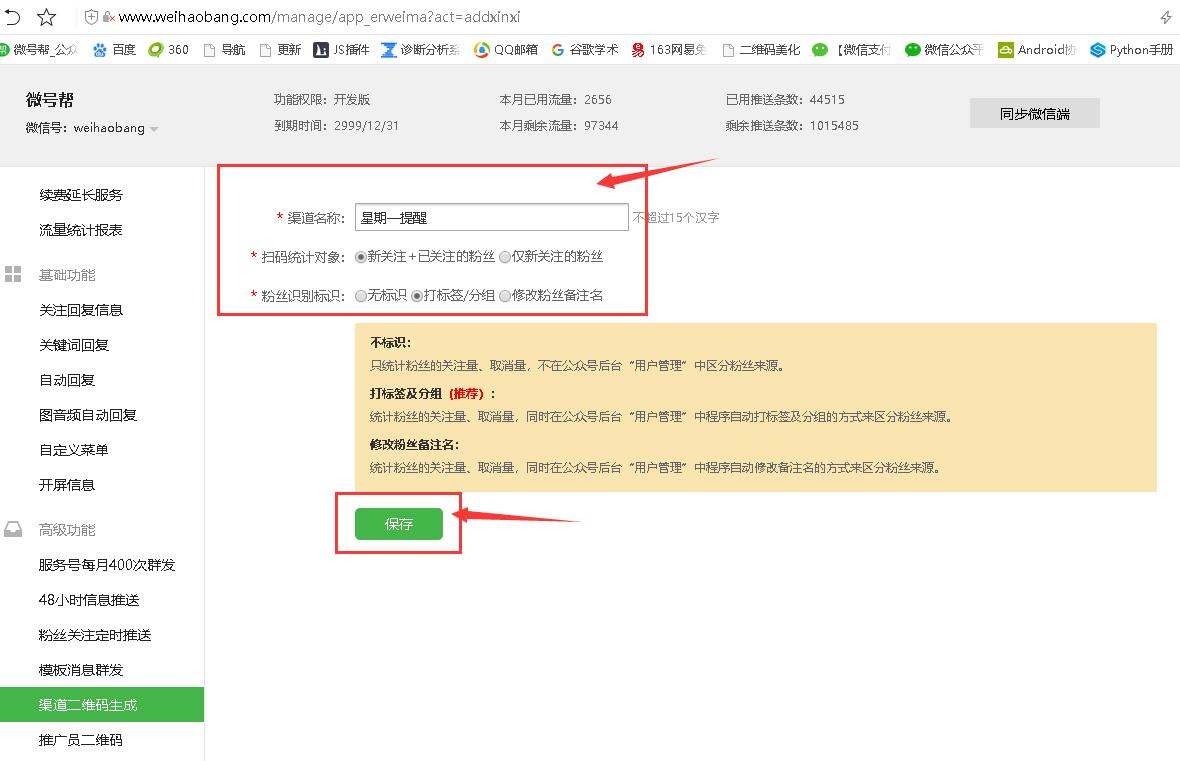 微信公众号推广时,用户通过扫码关注公众号,统计用户是通过哪个带场景二维码进行关注的,并对用户自动分组打标签备注。直接使用微号帮平台渠道二维码生成功能即可实现。