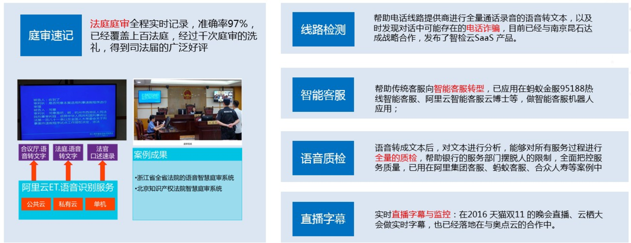 阿里云智能语音交互是基于语音识别、语音合成、自然语言理解等技术,赋予产品“能听、会说、懂你”式的智能人机交互体验。目前,阿里云智能语音交互已在庭审速记、线路检测、智能客服、语音质检、直播字幕等场景落地。