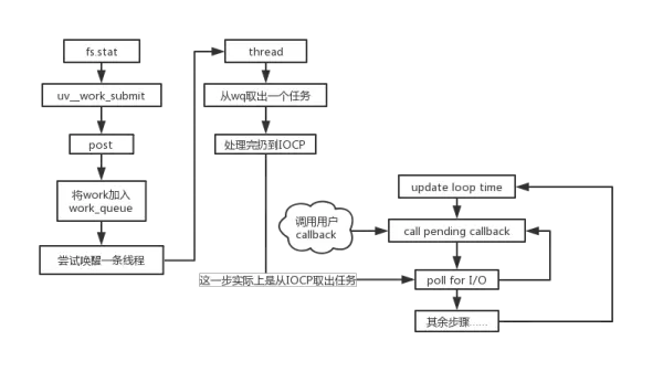 } 就这样,完美的把poll for I/O与call pending callback两块内容连接到了一起,也同时理解了一个异步I/O操作是如何在node内部被处理的。