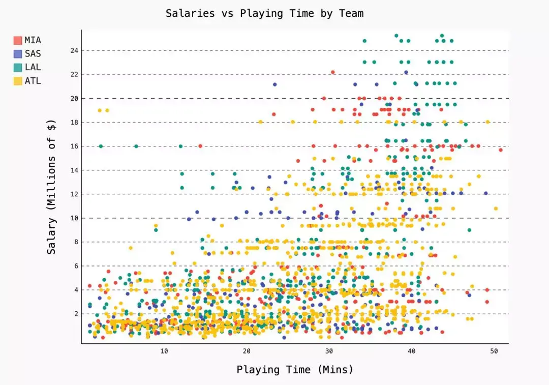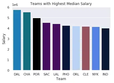 在处理篮球队薪资数据时,我想找出薪资中位数最高的团队。为了展示结果,我将每个球队的工资用颜色标成条形图,来说明球员加入哪一支球队才能获得更好的待遇。