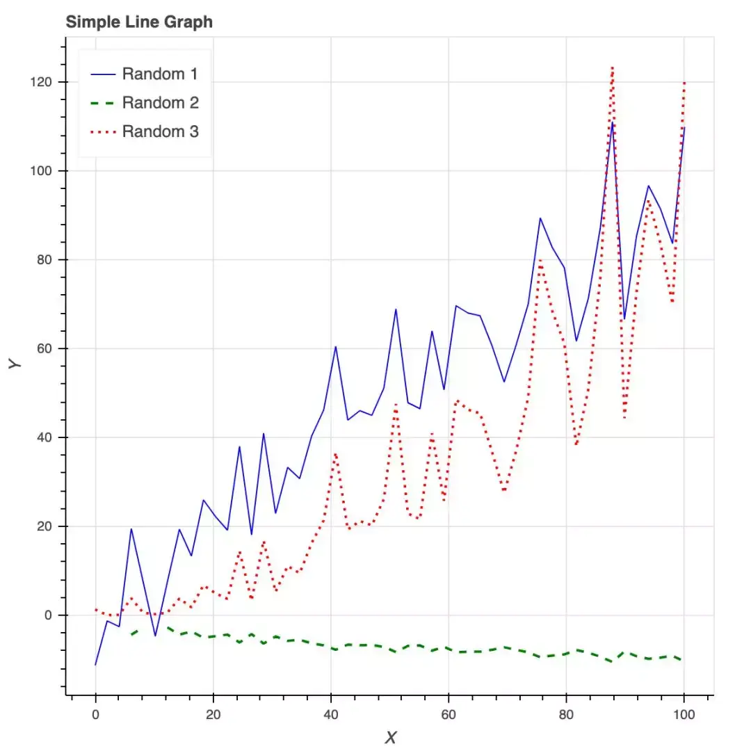 Bokeh 提供的所有便利都要在 matplotlib 中自定义,包括 x 轴标签的角度、背景线、y 轴刻度以及字体(大小、斜体、粗体)等。下图展示了一些随机趋势,其自定义程度更高:使用了图例和不同的颜色和线条。