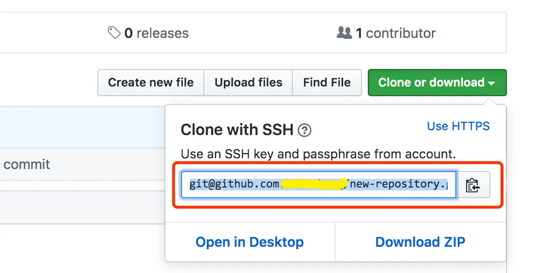 打开需要拷贝的仓库链接,点击右侧按钮:Clone or download,获得一个git地址(例如:git@github.com:user-name/new-repository.git)