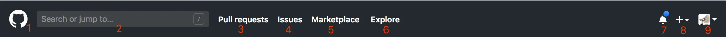 铃铛旁边蓝色的点提示用户是否有新的通知。(默认设置中,用户在GitHub收到通知会同时发送到该账户的注册邮箱)