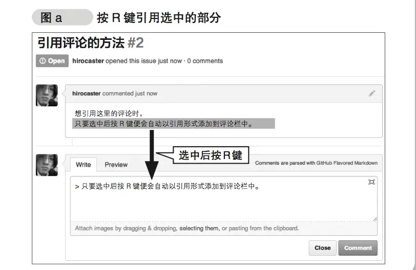 小功能:想要引用别人的评论,可以选中当前评论,按R键,被选择的部分会自动以评论语法写入评论文本框。