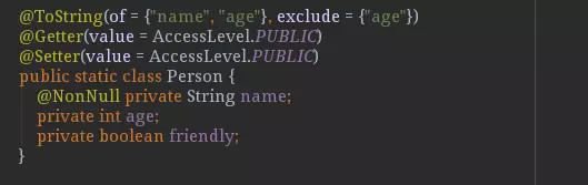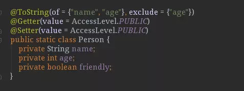 @ToString:作用于类,覆盖默认的toString()方法,可以通过of属性限定显示某些字段,通过exclude属性排除某些字段。