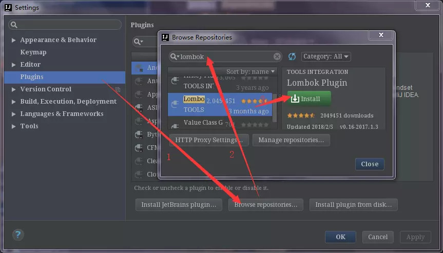 IDEA中引入Lombok支持如下: 点击File-- Settings设置界面,安装Lombok插件: