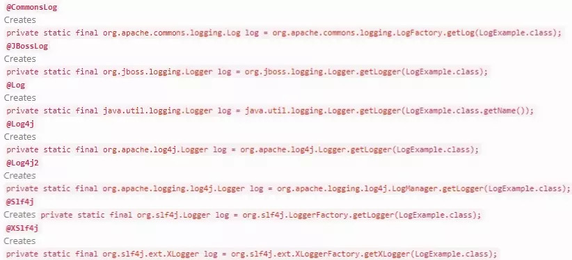 @Log:作用于类上,生成日志变量。针对不同的日志实现产品,有不同的注解: