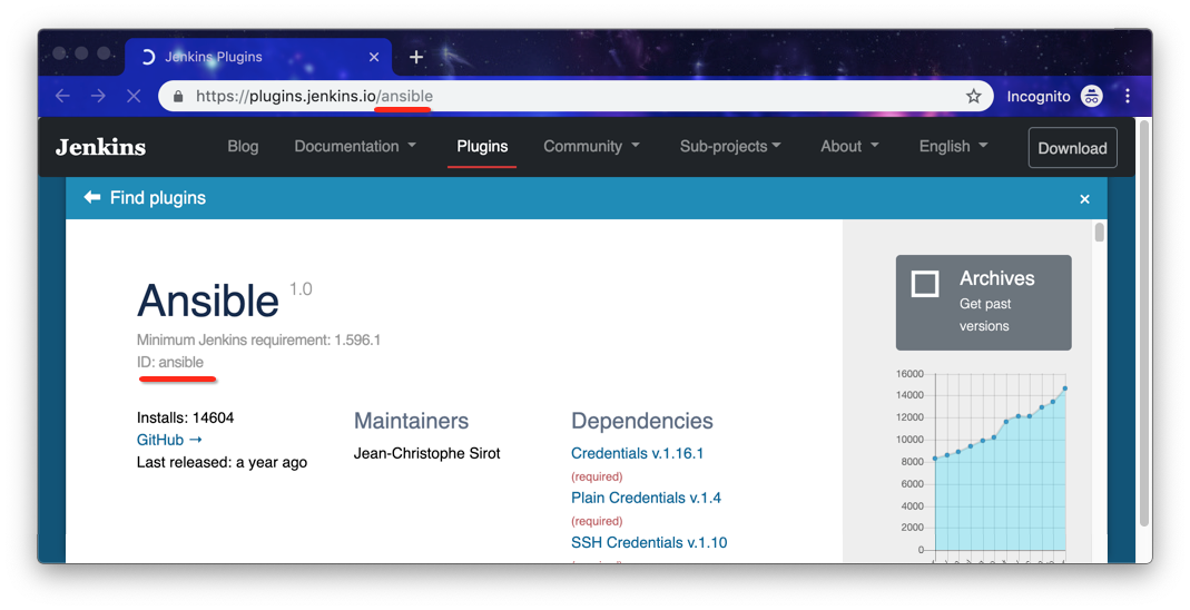如何知道一个插件的 short name 呢?可以在 Jenkins 插件官网上找到,比如 Ansible 的: