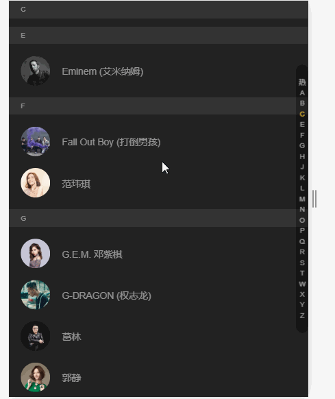 // 每一个歌手的li标签的高度必须要保持一致,我这里的高度是70,可以计算自己项目的内容的具体高度进行修改