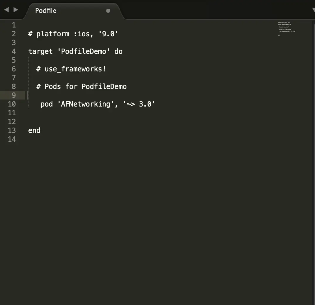在项目中我们执行完pod install后再目录下会生成Podfile。删除一些注释,添加AFNetwirking后1我们得到了这样的文件。