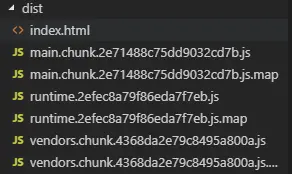 此时,用户首次进入页面后,main.js和vendor.chunk.js会被浏览器缓存起来,这样用户第二次进页面,就不用重新下载js了,但是这样会造成一个问题,我们没有加hash值,所以如果js发生变化,用户不强制刷新的话,代码时不会被更新的。