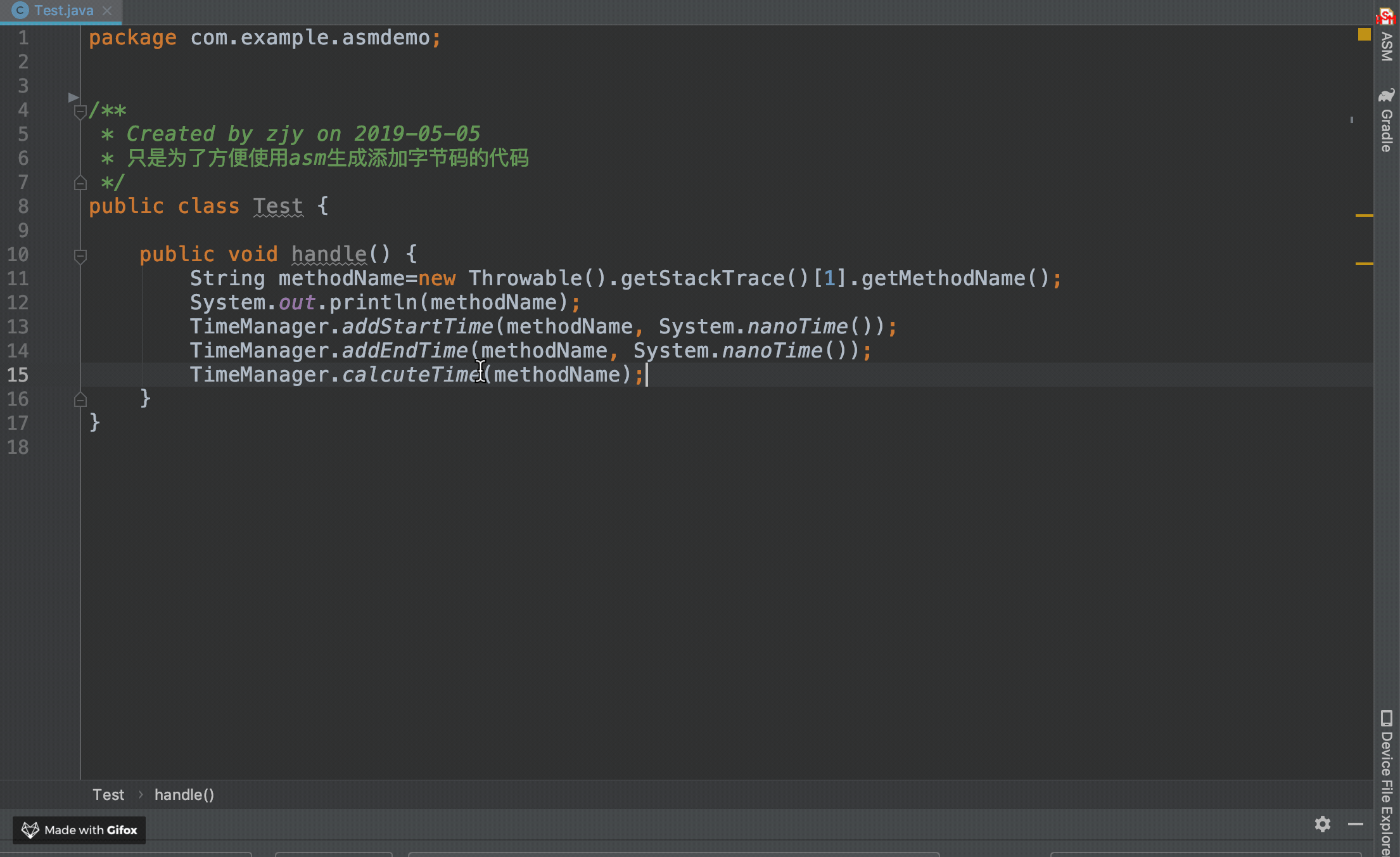 mv.visitMethodInsn(INVOKESTATIC, "com/example/asmdemo/TimeManager", "calcuteTime", "(Ljava/lang/String;)V", false);