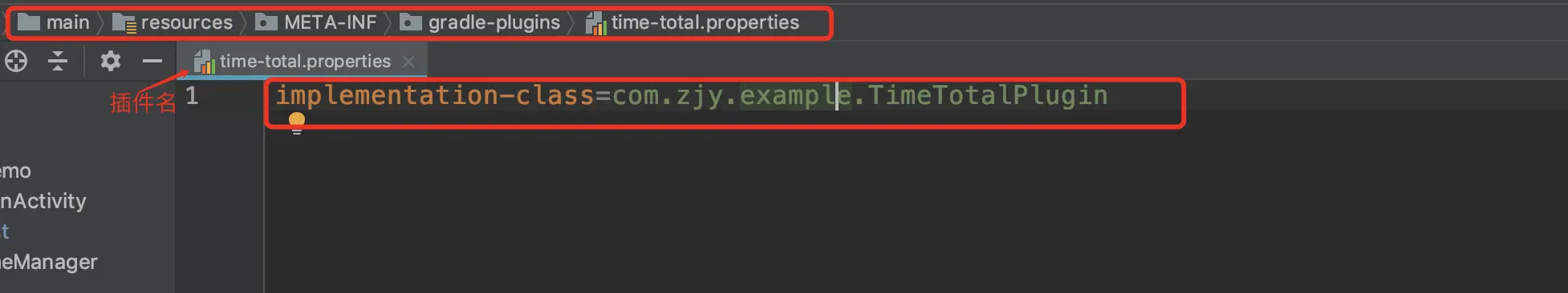 那么如此一来,整个就关联起来了,这个插件也基本成型,可以直接在app的build.gradle中使用apply plugin :完整的插件类名,当然也可以使用apply plugin:xxx引用,那我们就需要在这个buildSrc下面的main中新建resources->META-INF->gradle-plugins路径(别问为啥要这这样路径,这就规定),然后新建一个插件名.properties文件,里面使用implementation-class来关联自己的插件: