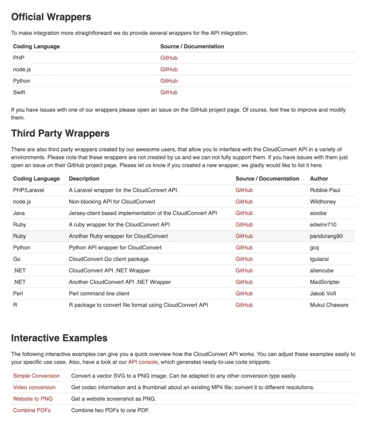 ConvertCloud 在 GitHub 上公开了多种语言所编写的官方程序包,你可以在 CloudConvert 的 API 页面 查看第三方程序包、应用实例及官方文档。