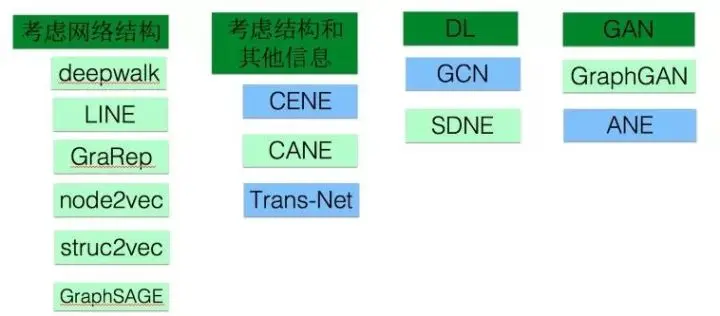 Graph embedding(GE)也叫做network embedding(NE)也叫做Graph representation learning(GRL),或者network representation learning(NRL),最近有篇文章把graph和network区分开来了,说graph一般表示抽象的图比如知识图谱,network表示实体构成的图例如社交网络, 我觉得有点过分区分了。图1.1是整个GE大家族,本文只介绍绿色的,蓝色模型就不一一介绍了。严格来说,图卷积也属于GE的一部分,由于目标不同以及其关注度较大,我们单独划分出来(文章第二部分)