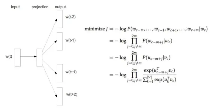 Word2vec是根据语料库中单词的共现关系求出每个单词的embedding。常用word2vec模型有cbow和skip-gram,cbow根据上下文预测中心词,skip-gram根据中心词预测上下文。由于两种模型相似,本节只介绍skip-gram模型。
