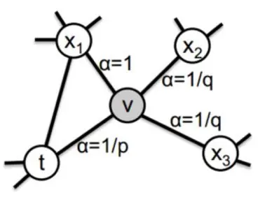 图1.6是p, q控制的二阶随机游走的示意图,其中a是关于当前节点v搜索下一个节点2的函数,p,q为超参数,表达式如下: