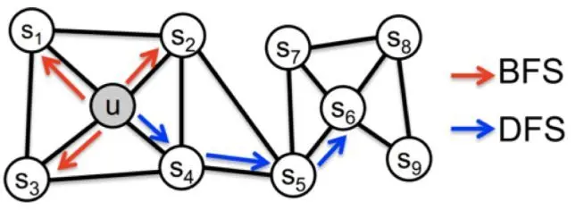 前面说到Deepwalk其实是基FDFS模型, LINE和GraRep是基于DFS的模型,一般来说基于BFS的模型倾向于获取图中的内容相似性(即局部相似性),基于DFS的夜型更倾向于获取结构相似性。那么能否设计一种可以平衡BFS和DFS的模型呢? Node2vec给出了一种方案,它设计了一个二阶随机游走,通过p, q两个参数来平衡BFS和DIS两种搜索策略。