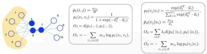 1st order proximity:在高维层次即原始图中,表示为节点之间的边权;在低位层次即两个向量要是比较近似的,用一个sigmoid函数表示。
