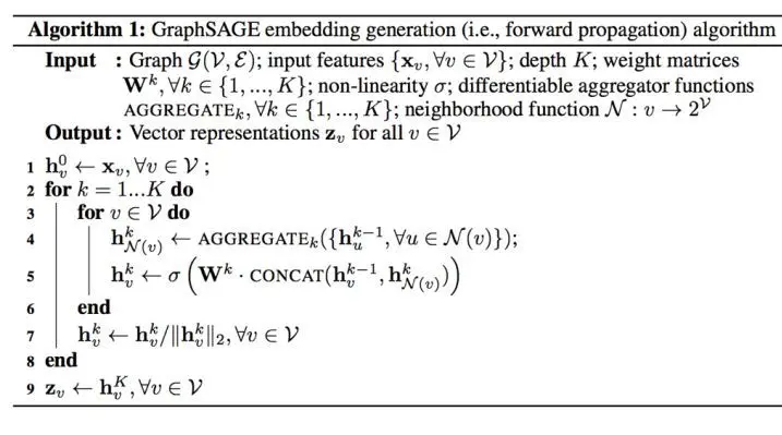 前面介绍的模型全部都是直推式学习,换句话说当graph变化时,需要重新学习。GraphSAGE是归纳式学习的一个代表,它不直接学习每个节点的表示,而是学习聚合函数,学到了聚合函数以后,对于新增的节点我直接生成它的embedding表示,而不需要重头学习。下面算法就是GraphSAGE的核心内容了,图1.8更形象的表示这一算法。