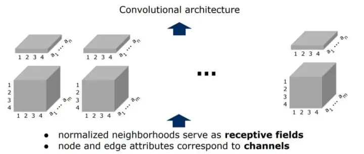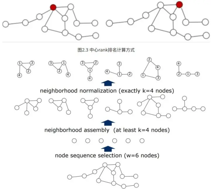 2.2选出的节点如果不够,补充0向量,如果多了就按照中心rank排名删除后面的节点. - 选出的w个节点,每个节点和其邻域节点都可以组成规则的(K + 1) * F的矩阵,而所有的边也可以组成-个(K +1)*(K + 1)* F的张量,在这些张量上做卷积,如图2.5。