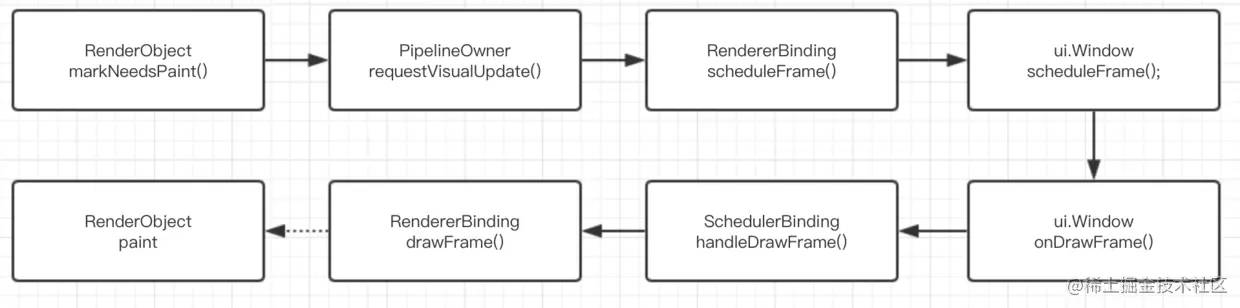 RenderObject在attch/layout之后会通过markNeedsPaint();使得页面重绘,流程大概如下: