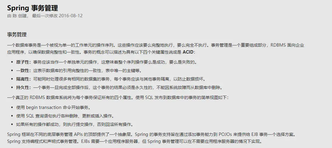 - 事务管理:Spring 提供一个持续的事务管理接口,可以扩展到上至本地事务下至全局事务(JTA)。