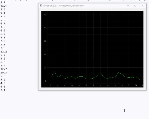 运行上述代码,我们可以得到如下动图所示的实时更新图形界面,每一秒获取到的CPU使用率数据都实时绘制为了线条: